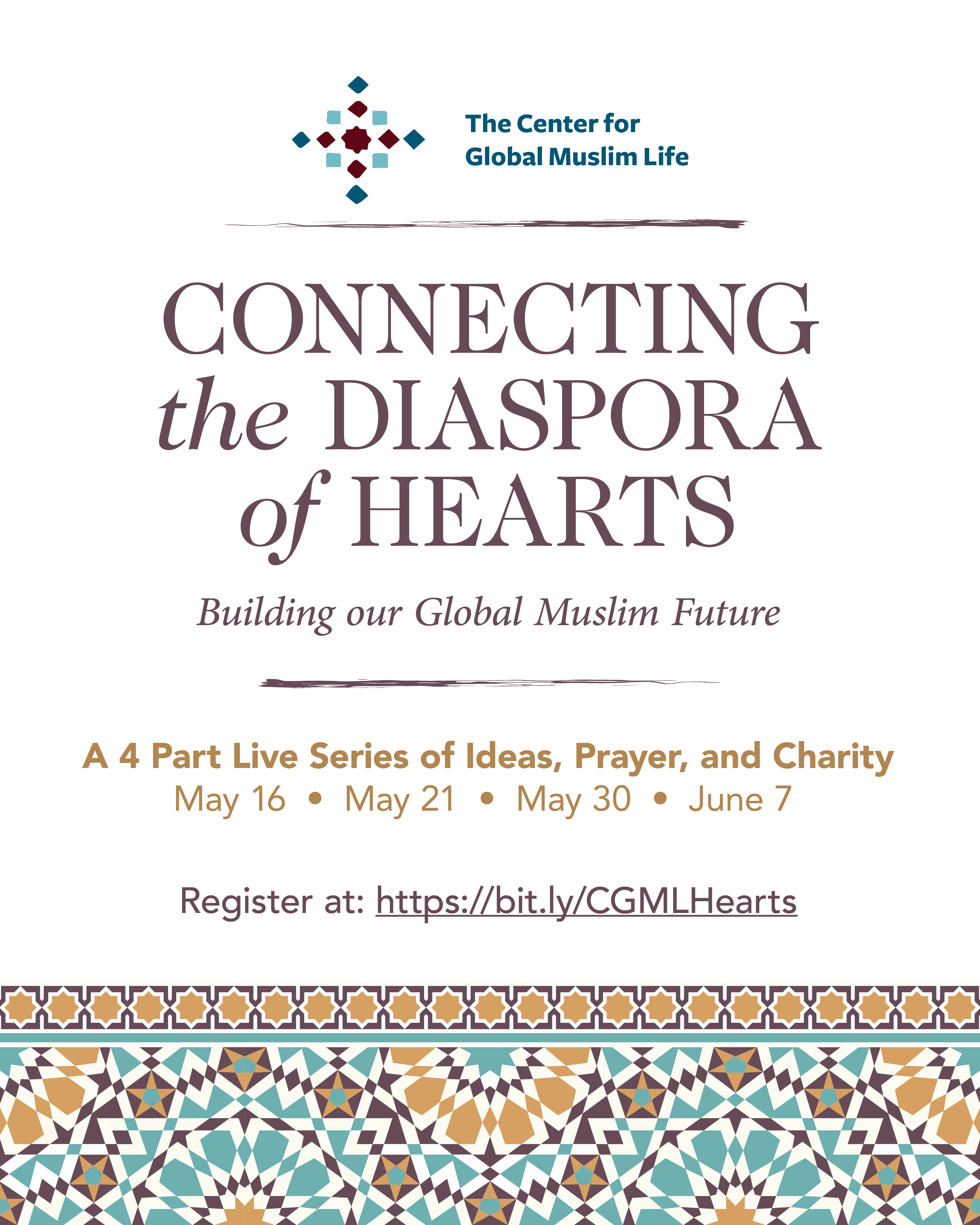In this time it is more important than ever that Muslim communities are able to connect with each other around the world and learn best practices from each other in times of crisis. With this in mind, the Center for Global Muslim Life is organizing a series of symposia with global Muslim institutions, thinkers, religious scholars, medical professionals, artists, and people making social impact around the world. The first symposium will take place over 4 parts through the end of Ramadan and the Eid holiday, "Connecting the Diaspora of Hearts - Building Our Global Muslim Future."